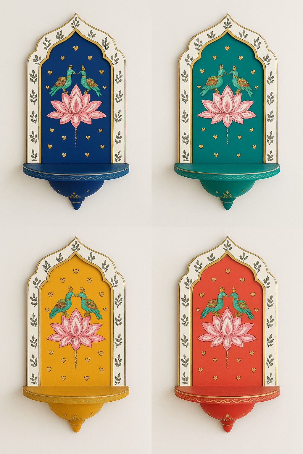 Transform any wall into a gallery of light. Our miniature jharokha t-lite holders feature intricate mirror-work and vibrant hand-painting โ arrange them in clusters for a breathtaking display.